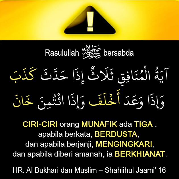 Ciri dalam al quransunting · hatinya sakit [al baqarah: Dengan kata lain, munafik berarti tak . Bahkan dalam agama islam, munafik merupakan sifat yang dibenci . Tidak amanah dan tidak jujur · 2. Sering ingkar janji · 3.